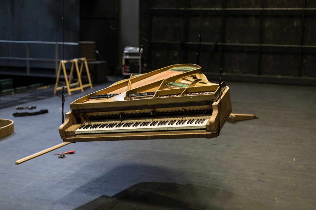Tout commence (et, dans un sens, finit) avec Funérailles de Franz Liszt, pièce romantique virtuose composée en mémoire de trois amis tombés lors de la révolution hongroise de 1848. Entre tombeau profané, dépouille offerte au scalpel du médecin légiste et machinerie désossée, l’instrument-roi s’entrouvre alors, littéralement, se défait, comme pour mieux laisser voir la musique qui le traverse, s’échappe de ses entrailles. Dans la salle de concert transformée en théâtre anatomique, la scène devient surréaliste : le piano est savamment et implacablement déconstruit, démembré. Toujours résonnants, ses organes isolés, suspendus dans l’espace, semblent dotés de vie. A la manière d’une science-fiction, c’est comme si nous rétrécissions pour pénétrer dans les dédales de l’instrument, tandis que l’écoute, elle, s’élargit et fond dans les détails du tableau sonore.