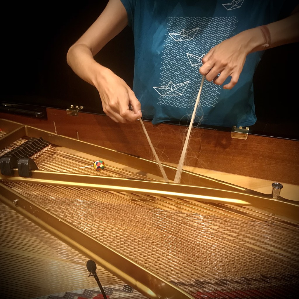 Le piano, c’est très solitaire ! Tu mets aussi tellement d’années à obtenir une technique transcendante pour pouvoir jouer le grand répertoire – concrètement, et en exagérant un poil, c’est six heures par jour pendant deux décennies. La formation, et le temps et l’énergie qu’elle te demande, ne te laissent pas trop d’opportunité pour sortir de ce territoire… Mais pour répondre à ta question, je ne me suis pas du tout ouverte immédiatement à ces autres champs. C’est passé par des prises de conscience très lentes, beaucoup de temps pris à cheminer, réfléchir entre chaque étape. Au début, je dirais même que ça a été un peu déroutant. Je sentais que je devais déconstruire la gestuelle – par exemple, en faisant résonner le piano de l’intérieur plutôt que sur le clavier, en produisant des sons que je n’avais jamais entendus auparavant. J’avais pu jouer des pièces de Cage ou de Cowell qui allaient dans ce sens, mais il ne s’agissait plus de reproduire leur musique : je devais trouver une grammaire qui m’était propre. La rencontre avec Alain Savouret date de 2000, mais il m’a fallu une décennie pour commencer à entreprendre des projets et à les produire. J’ai d’abord travaillé en tant qu’interprète pour des compositeurs comme Samuel Sighicelli, dont l’approche allait plus vers l’écriture de plateau, pour petit à petit pouvoir m’engager vers la conception de performances ou de spectacles personnels.